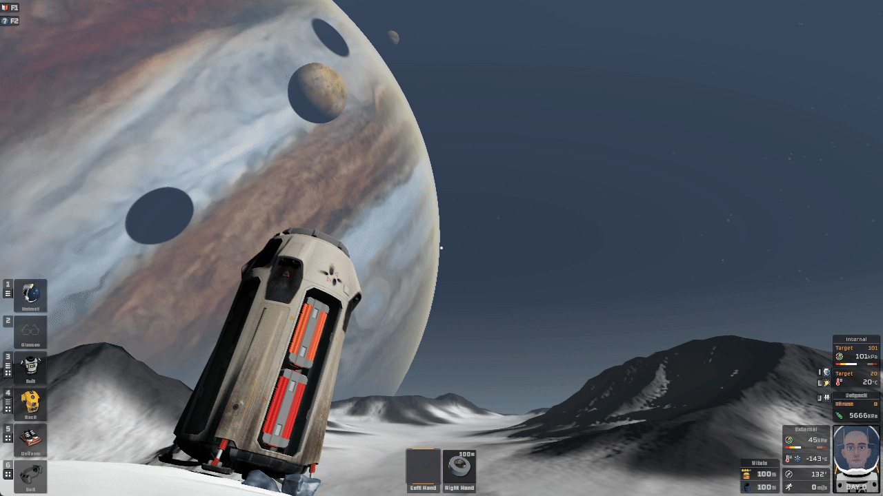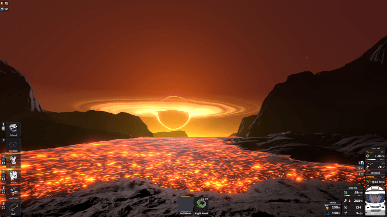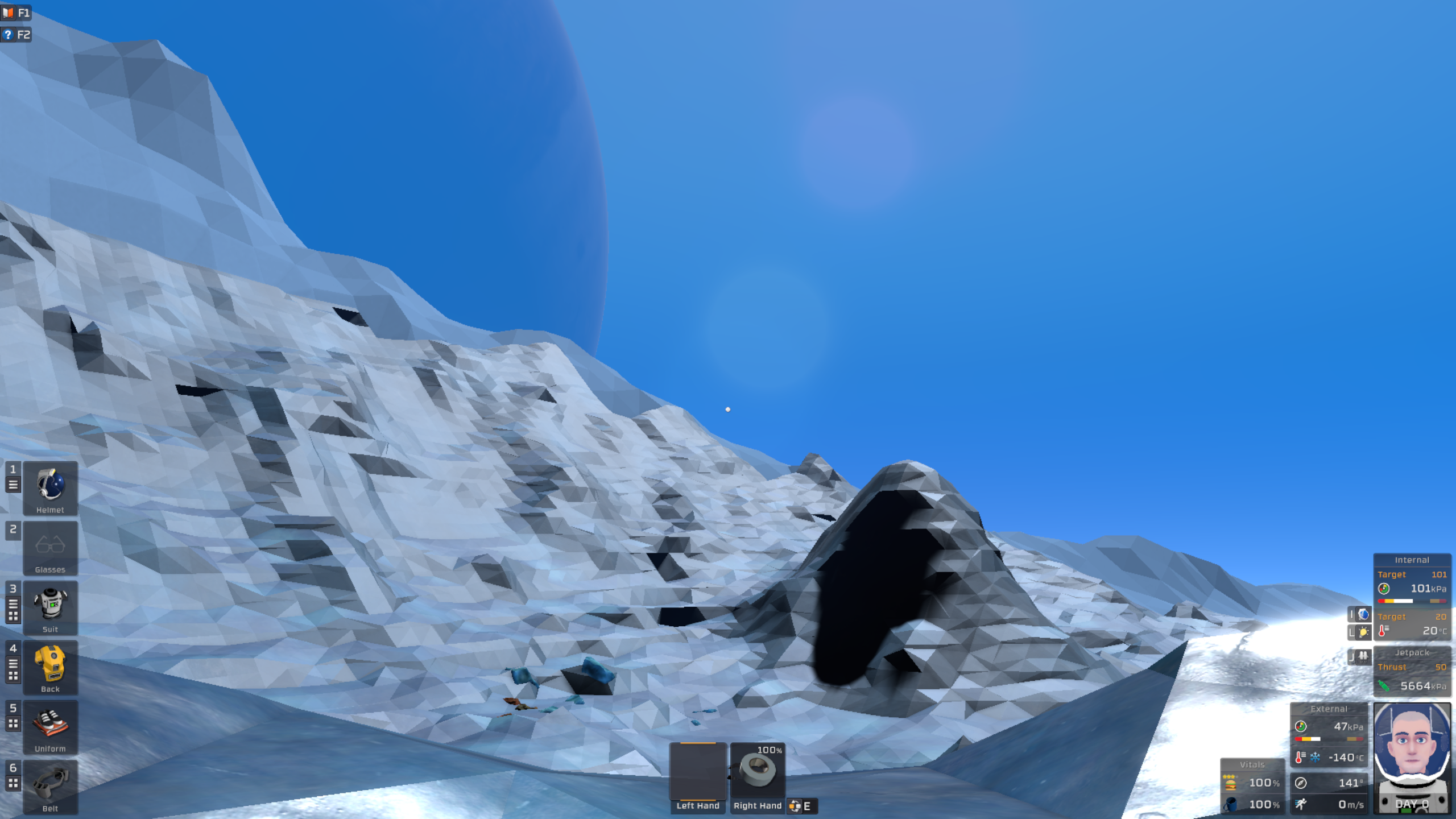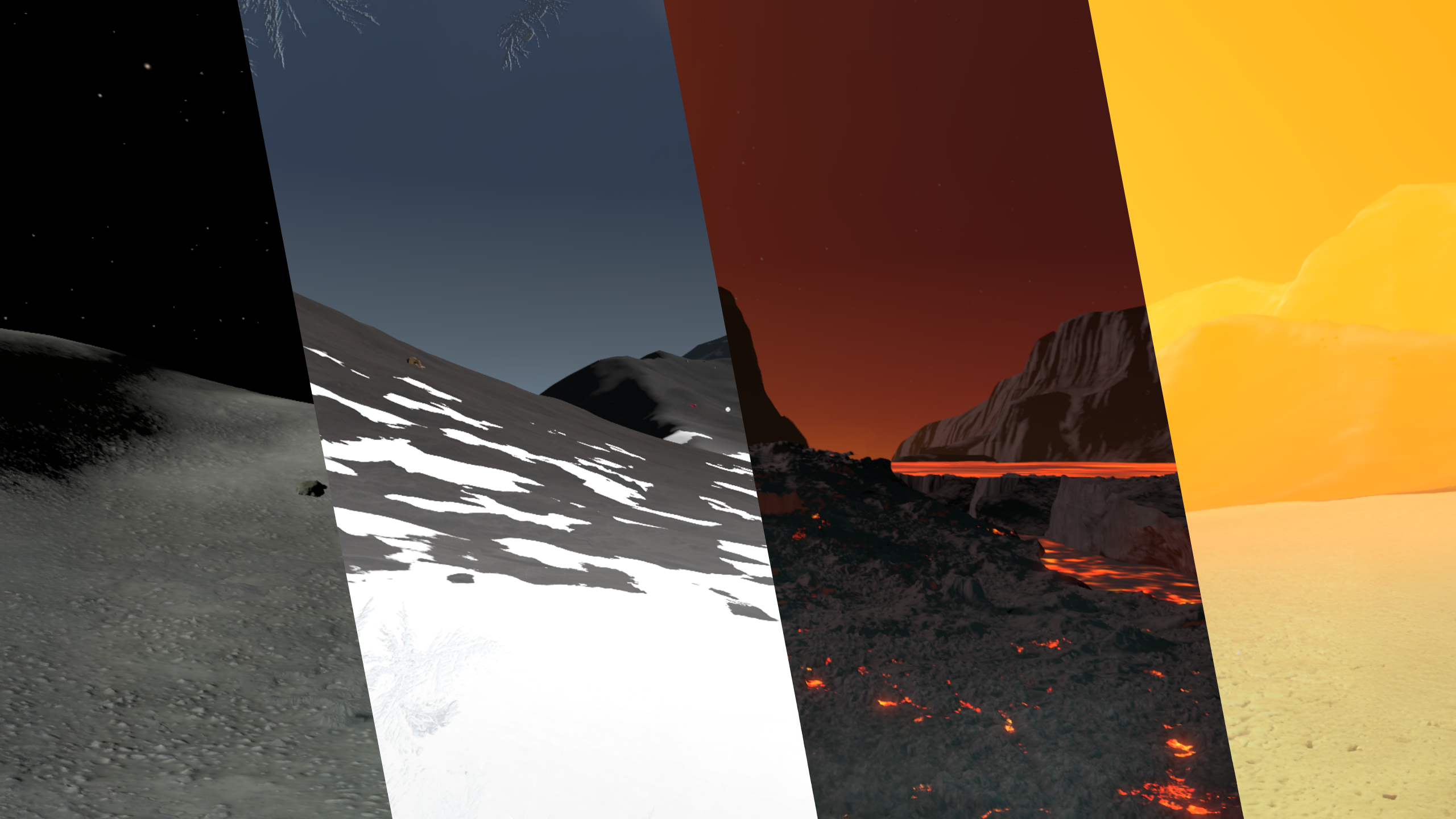 The terrain is rendered with a completely new material that supports a range of features. The largest improvement is the ability for multiple sets of textures, representing multiple voxel types, to dynamically blend together. This is leveraged in many different ways and is a powerful tool for creating new and interesting planets. For example, on Vulcan there’s glowing rocks around the lava, while on Europa there’s a thick layer of ice and snow contrasting the black rock that lays beneath.