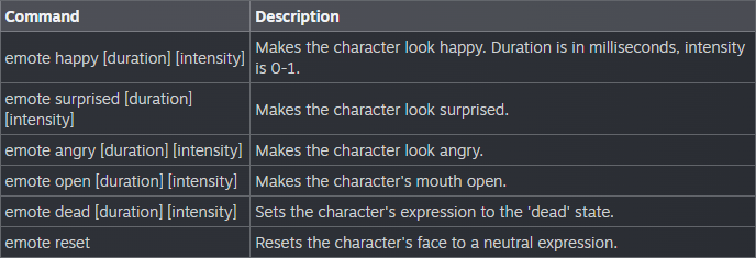 You can now express yourself in-game with a range of new facial expressions, controlled via the emote console command. This system also includes automatic expressions for 'Death' and 'Unconscious' states for added immersion. The available commands are: