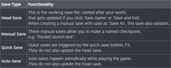 The old save system was often described as unintuitive. It had confusing components, such as the backup system, which didn't always behave how people expected. A single save file misunderstanding could ruin hours of work and sour a day-long play session. So, there are two main new concepts to understand about the new save system - save files are now compressed into a single .save file and the save file structure has been changed to be a lot clearer.